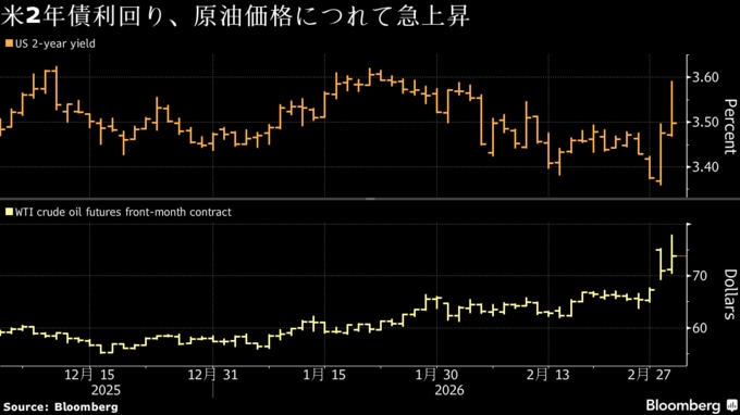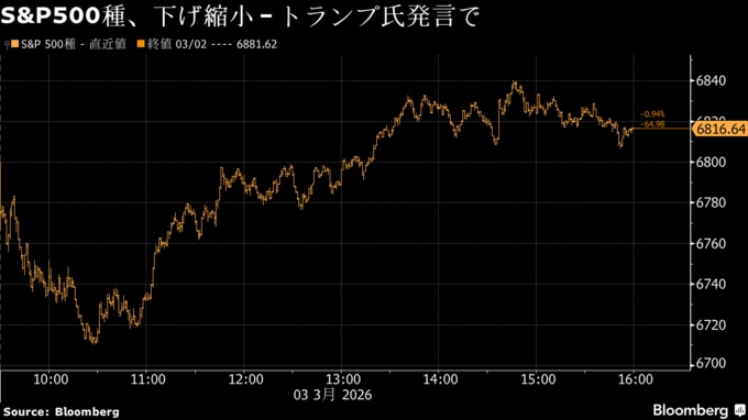 (ブルームバーグ):3日の米金融市場では株式と国債相場がいずれも下げ幅を縮小した。イランでの戦闘が引き続きあらゆる資産クラスで激しい値動きを誘発したが、トランプ米大統領が海上輸送路の確保に向けて行動を起こすと表明したことで、原油価格が上げ幅を縮めた。