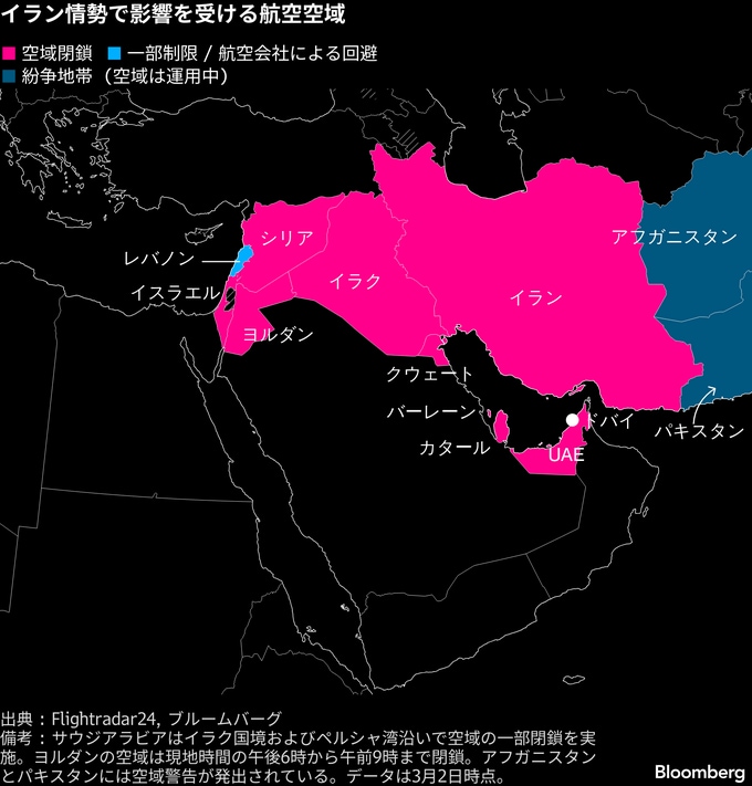 (ブルームバーグ):中東全域で紛争が拡大する中、足止めされた旅行者らは商業航空便の大半が運休となった地域から脱出するため、複雑な迂回(うかい)ルートを自力で探らざるを得なくなっている。