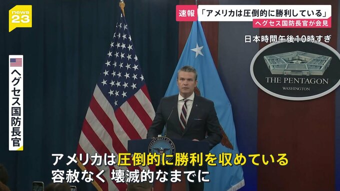 イランへの攻撃をめぐり、先ほど、アメリカのヘグセス国防長官が記者会見を行い、「アメリカは圧倒的に勝利している」と強調しました。アメリカ ヘグセス国防長官「アメリカは圧倒的に勝利を収めている。容赦なく…