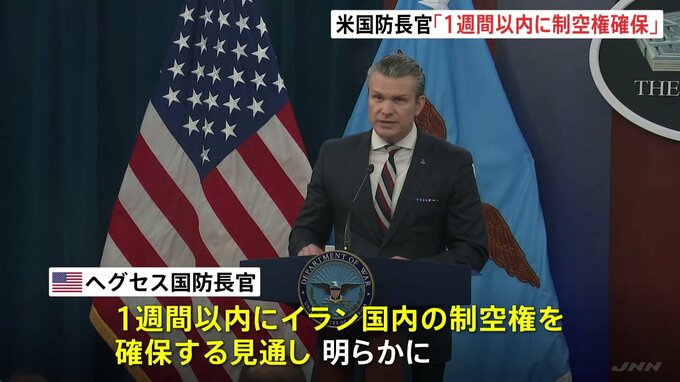 アメリカとイスラエルの攻撃で、イランの死者は1000人を超えました。アメリカのヘグセス国防長官は、1週間以内にイラン国内の制空権を確保するとの見通しを示しました。アメリカ ヘグセス国防長官「アメリカは圧…