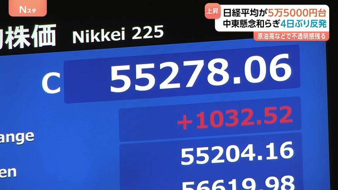 イラン情勢を受け、きのうまで大幅な下落が続いていた株価。きょうは一転して買い戻しが広がり、節目の5万5000円台を回復しました。きょうの東京株式市場は取引開始直後から全面高の展開で、日経平均株価は一時230…