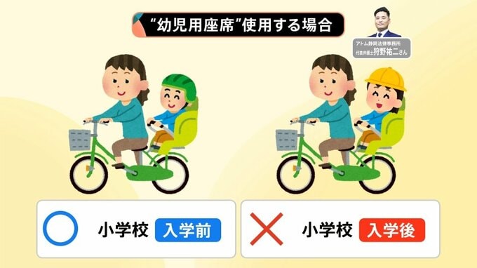 幼児用座席を使用する場合、子どもが小学校「入学前」(未就学児)ならOKですが、「入学後」は反則金が科せられるおそれがあるそうです。