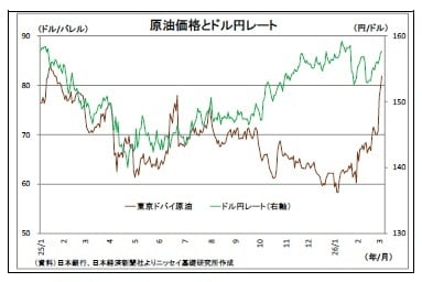 原油価格とドル円レートこのように、有事のドル買いや日本の貿易赤字拡大への思惑が高まったことで、今月に入ってからのドル円はやや円安ドル高に振れている。日米協調での円買い介入実施に対する警戒感が燻っているため円の下値は支えられているものの、ドル円は高止まりしている。
