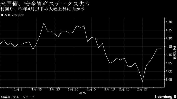 10年債利回りは今週、20ベーシスポイント(bp、1bp=0.01%)上昇し、昨年4月の米関税措置を巡る混乱以来の大幅な上昇となる見通しだ。先月は1年ぶりの大幅低下を記録していたが、様相は一変した。