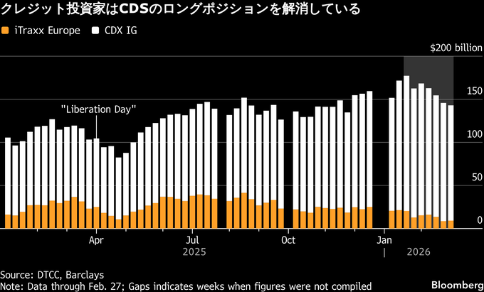 英銀バークレイズが米決済機関のデポジトリー・トラスト・アンド・クリアリング(DTCC)のデータを基にまとめたところによると、ソフトウエア分野への不安を背景に、CDS指数でみられる強気ポジションは、ここ数週間で縮小している。週次データにはイランでの戦争の影響はまだ反映されていないものの、CDS指数スプレッドは、取引量を増加させながら急拡大しており、ポジション調整が進行中であることを示唆している。
