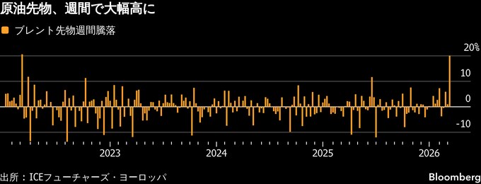 ニューヨーク原油先物は大幅続伸し、ウェスト・テキサス・インターミディエート(WTI)先物は週間ベースで過去最大の上昇率を記録した。ホルムズ海峡を通る海上輸送がほぼ完全に停止し、中東での戦争でエネルギー市場全体に混乱の波が広がっている。