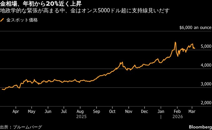 金スポット価格はニューヨーク時間午後3時27分現在、前日比72.54ドル(1.4%)高い1オンス=5154.84ドル。ニューヨーク商品取引所(COMEX)の金先物4月限は、80ドル(1.6%)上昇の5158.70ドル。