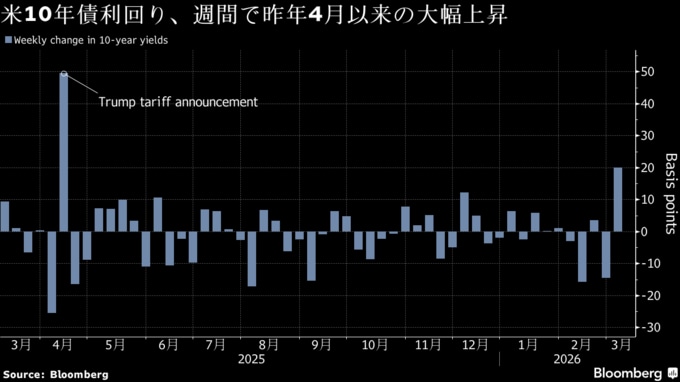 米国債相場は週間ベースでは、トランプ大統領が包括的な関税を発表した2025年4月以来の大幅下落。原油急騰でインフレ懸念が強まったことが背景にある。