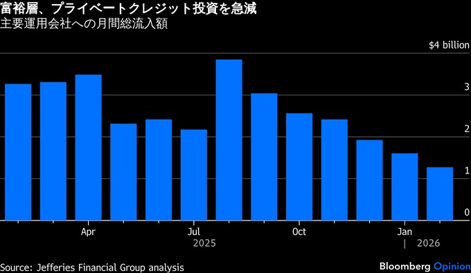 富裕層からBDCへの資金流入は、解約請求が増えるのと同時に大きく落ち込んでいる。ジェフリーズ・ファイナンシャル・グループのアナリストによると、先月の富裕層からプライベートクレジットへの総流入額は12億7000万ドルと、1年前の32億7000万ドルの半分以下にとどまり、過去12カ月で最も低い水準だった。