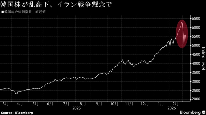 原題:South Korean Stocks Sink as Global Funds Sell on Iran War Risks(抜粋)
