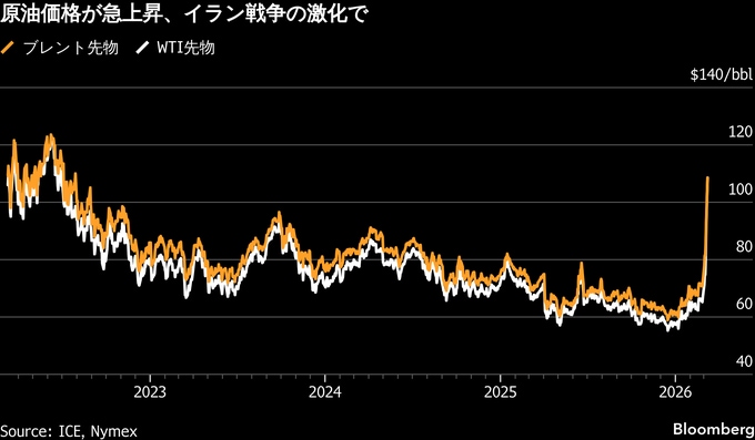 (ブルームバーグ):9日の取引で、原油価格が一時1バレル=100ドル台に上昇したが、その後上げ幅を縮小し、90ドル台で推移している。ホルムズ海峡を経由するタンカーの航行が事実上停止し、世界各地への供給が圧迫を受ける中、主要経済国が石油備蓄の共同放出など必要な対策を講じる姿勢を示した。