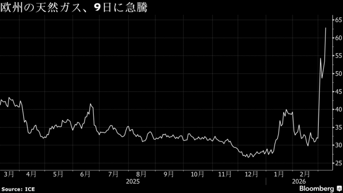 指標のガス先物は一時30%上昇。中東情勢の緊迫化で主要産油国が相次いで生産を抑制し、ホルムズ海峡が事実上閉鎖となる中、原油価格が1バレル=100ドルを上回る水準に急伸した。米国の天然ガス先物も上昇し、1カ月ぶりの高値を付けた。