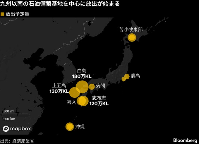 日本は16日に民間備蓄の放出を保有義務を70日から55日分に引き下げる形で開始した。26日からは国家備蓄の放出を国内11カ所の備蓄基地から1カ月分の放出を順次始めた。