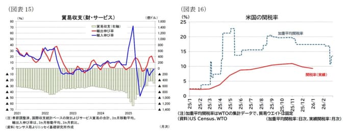 このため通商政策を巡る不確実性は当面残るとみられるが、関税による輸入抑制の影響が続くことを踏まえると、26年の外需寄与度は小幅ながらプラスを維持する可能性が高い。