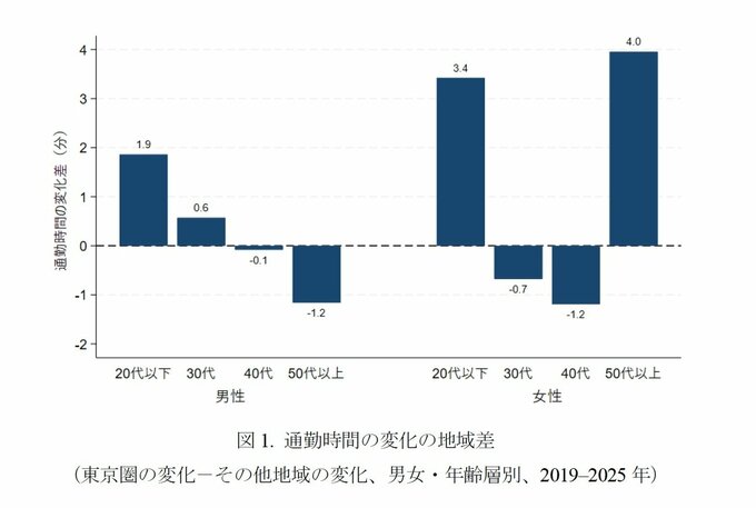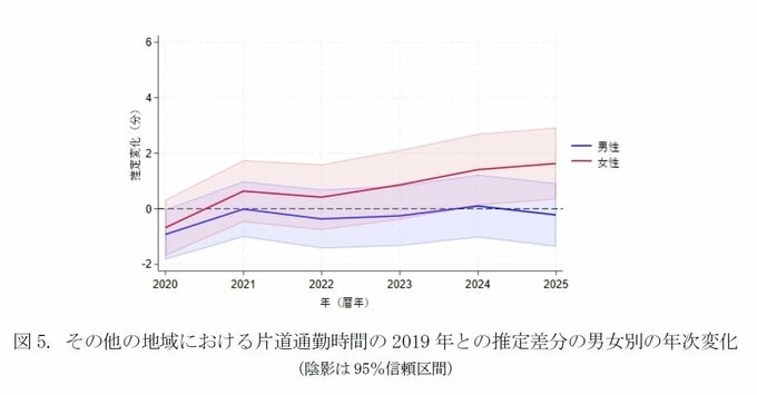 その結果、いずれの地域においても、男性では通勤時間に大きな変化がみられなかった一方、女性では通勤時間が増加する傾向が確認された。
