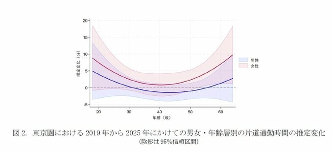 一方、女性については両地域とも、推定変化の曲線はゼロを上回っており、通勤時間が年齢層を問わず増加した傾向がうかがえる。