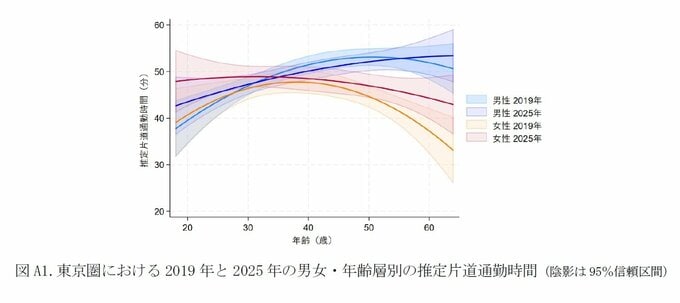 本稿では、2019年から2025年にかけての男女・年齢層別の平均片道通勤時間の変化を、東京圏とその他の地域に分けて分析した。