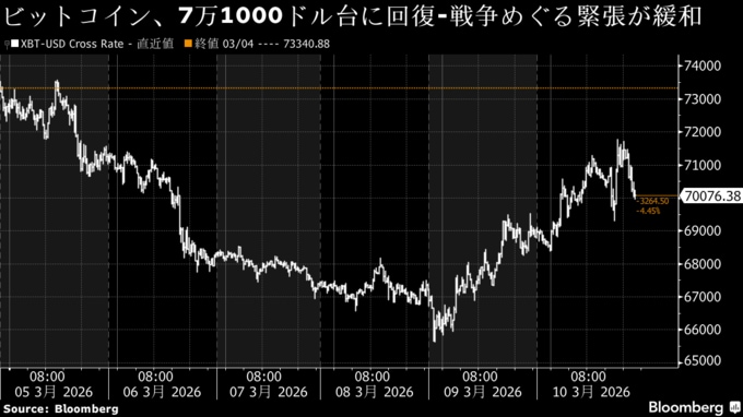 (ブルームバーグ):10日の暗号資産(仮想通貨)ビットコインは一時7万1000ドル台に回復した。イランでの戦争をめぐる懸念が和らぎ、リスク資産が持ち直すとともに原油価格が下落したことに反応した。