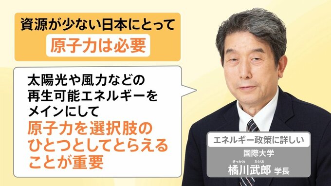 エネルギー政策に詳しい国際大学の橘川武郎 学長は、「資源がない日本にとって、原子力は必要」とした上で、「太陽光や風力などの再生可能エネルギーをメインにして、原子力を選択肢の一つとしてとらえることが重要」と話します。