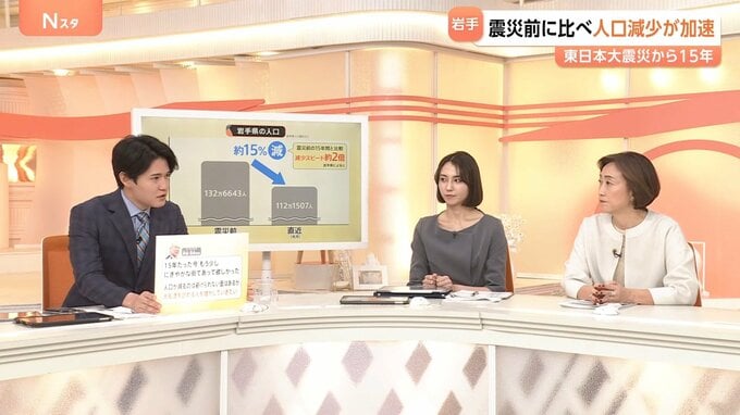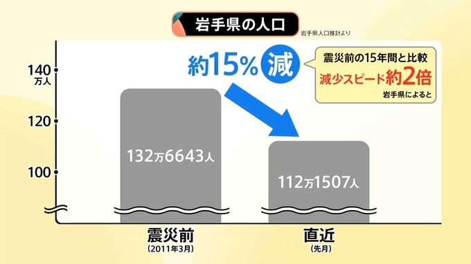 岩手県の人口は震災が発生する直前(2011年3月)から2026年2月までの15年間で約15%減少し、震災前の15年間と比較すると減少スピードは約2倍になっているということです。