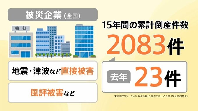 背景には地震や津波など直接的な被害に加え、風評被害などの間接的な影響が長引いていることが多く、東京商工リサーチによると、15年間の累計倒産件数は2083件で、2025年は23件あったということです。(東京商工リサーチより 負債金額1000万円以上の企業 / 2月28日時点)