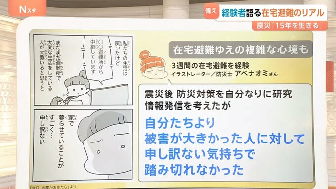 さらにアベナオミさんは「震災後、防災対策を自分なりに研究し、情報発信を考えたが、自分たちより被害が大きかった人に対して、申し訳ない気持ちで踏み切れなかった」と言います。