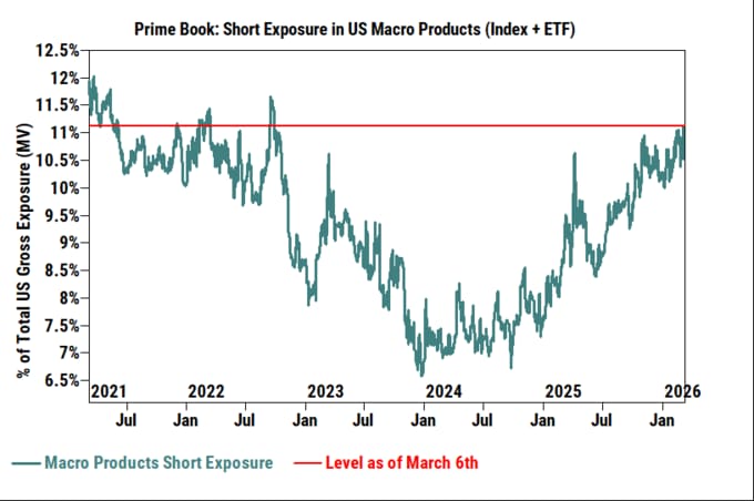 投機的な投資家は個別株の強気ポジションをおおむね維持する一方で、上場投資信託(ETF)や指数先物などを活用した弱気の賭けでヘッジを構築している。こうしたショートのエクスポージャーは、2022年9月以来の高水準に達していると、ゴールドマンのプライムブローカレッジ部門のデータが示した。
