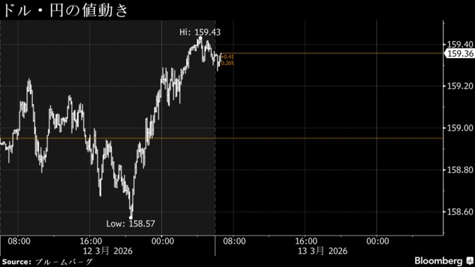 (ブルームバーグ):13日朝の東京外国為替市場の円相場は対ドルで159円台前半と年初来安値付近で推移。中東情勢の混迷による原油価格の上昇や堅調な米国経済指標を受けて、ドル買い・円売り圧力が強い。債券相場は下落が予想されている。
