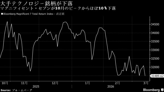 (ブルームバーグ):イラン戦争で原油価格が上昇し、インフレ懸念も高まる中、米株式相場が下落しており、大手テクノロジー銘柄も調整局面入りの瀬戸際に立たされている。