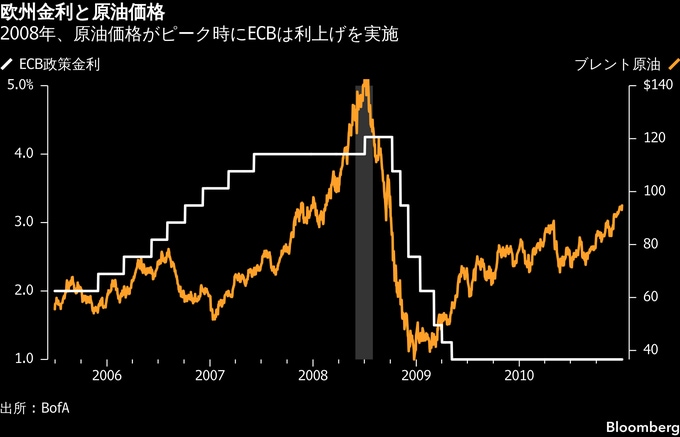 2008年7月、原油価格がピークを付けた当日にECBが金利を引き上げたのは「史上最大級の政策ミスだ」とハートネット氏は批判した。後に起きたリーマン・ブラザース破綻と、バレル40ドルへの原油価格急落を背景に「原油より信用収縮の方が深刻」との見方が広がり、ECBは結局、74日間で合計325ベーシスポイント(bp、1bp=0.01%)の利下げを「余儀なくされた」と同氏は解説した。