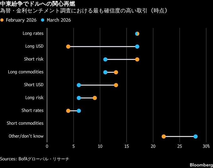 調査対象となったファンドマネジャーのうち、ドルのショートポジションが今年最も確信度の高い取引だと回答したのは6%で、2月の13%から低下。一方、ドルのロングポジションを今年最も確信度の高い取引と答えた割合は17%となり、2月の4%から上昇した。