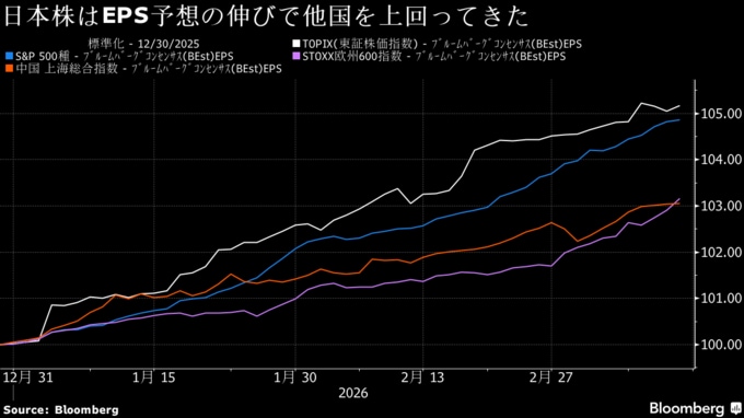 ブルームバーグの集計によると、直近半年の東証株価指数(TOPIX)の上げは大半が1株当たり利益(EPS)予想の増大によるもの。人工知能(AI)需要の拡大や為替の円安などを追い風に、今年のEPS予想の伸びは米欧や中国を上回る。しかし、日本は中東へのエネルギー依存度が高いため、戦争で雲行きが怪しくなってきた。