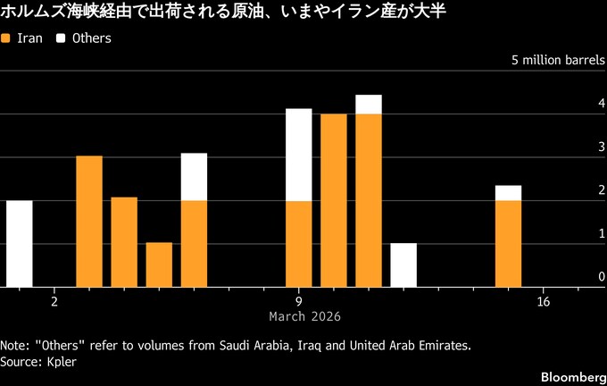 一方、イランはホルムズ海峡を通じた自国産原油の輸送は戦争前とほぼ同じペースを維持し、地域の他国の輸送が滞る中で海峡の支配を最大限活用している。