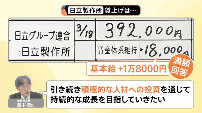 今回、日立製作所は、労働組合側の要求に満額回答し、ベースアップは過去最高水準となる1万8000円となりました。賃上げは4年連続だということです。