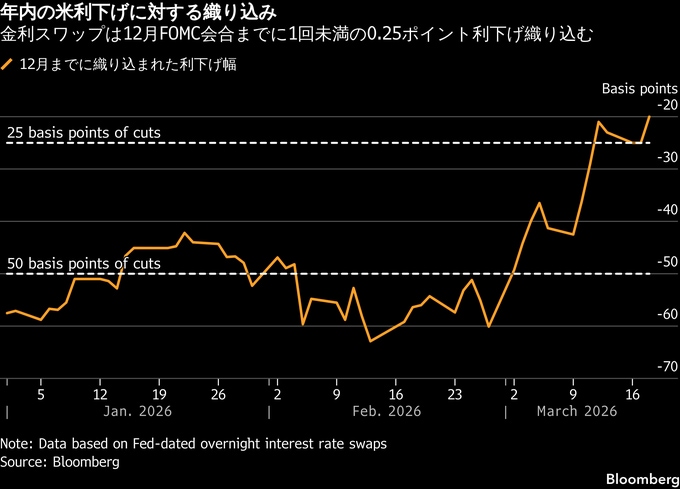 (ブルームバーグ):債券トレーダーらは、米連邦公開市場委員会(FOMC)による年内利下げを見込む姿勢を後退させ、1回の引き下げすら完全には織り込まなくなっている。中東での戦争に伴う原油価格の上昇圧力と、米インフレ指標が市場の予想外に加速したことが背景にある。