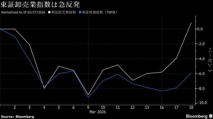 米国とイスラエルによるイランへの軍事作戦が開始されて以来、東京証券取引所の業種別指数で商社株の比率が大きい卸売業指数は1%上昇し、東証株価指数(TOPIX)の5.6%安を上回る。攻撃直後の1週間こそTOPIXと同程度下げたが、収益に対するエネルギー関連事業の比率が高い三菱商事と三井物産を筆頭に相場全体よりも速いペースで持ち直している。
