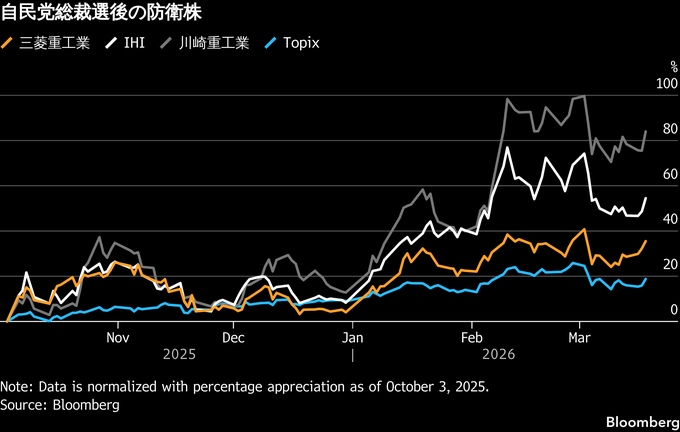 防衛力強化を掲げる政府方針を背景に、日本の防衛関連株は「高市トレード」の代表的な恩恵銘柄となってきた。高市早苗首相が昨年10月に自民党総裁に選出されて以降、川崎重工業は84%上昇、IHIは55%上昇している。