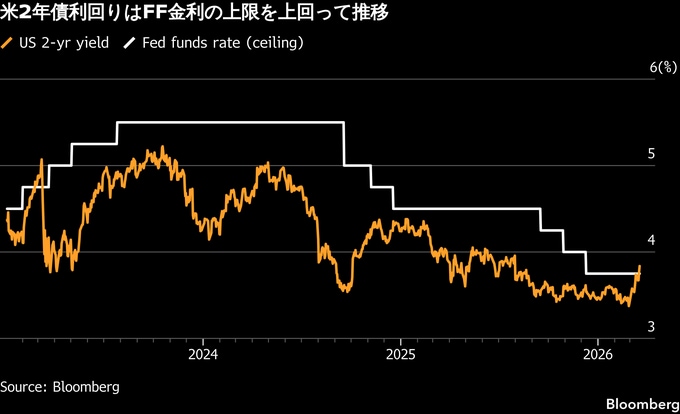 2年債利回りがFRBの政策金利上限をこれほど大きく上回るのは、利上げ局面にあった2023年以来。20日にはまた、5年債利回りが昨年7月以降で初めて4%を超えたほか、10年債利回りが一時、8月以来の高水準である4.39%を付けた。