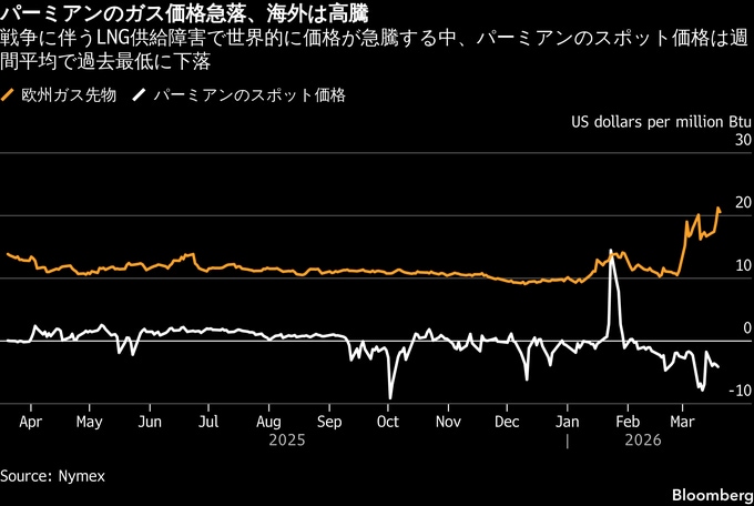 テキサス州西部では、原油の生産に伴って天然ガスが産出される。イランとの戦争に端を発した供給混乱を受けて原油価格が高騰する中、多くの掘削業者は高水準の生産維持に意欲的だ。だが、同地域はガスを輸出市場に送り出すインフラ整備が不十分で、その結果、現地のガス価格はマイナス圏に落ち込んでいる。