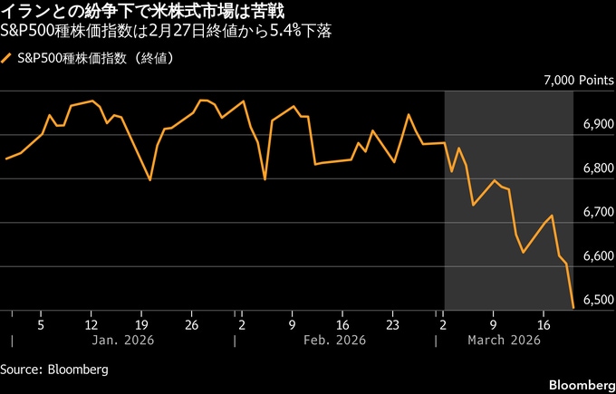 3週間前に中東で軍事衝突が始まって以降、株式市場は試練にさらされている。20日のS&P500種は前日比1.5%安の6506.48と、半年ぶりの安値を付けた。週間ベースでは4週連続の下落となり、この1年超で最長の下げを記録した。