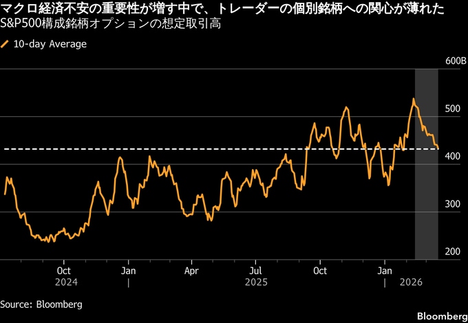 原油と天然ガスの価格急騰はサプライチェーン全体に波及し、ガソリンだけでなく、幅広い製品・サービス価格上昇を招く恐れがある。人工知能(AI)など細分化されたテーマよりマクロ経済不安の重要性が増す中で、トレーダーの個別銘柄への関心が薄れた。S&P500種株価指数に対する個別銘柄のボラティリティープレミアムは縮小し、取引高も減少した。