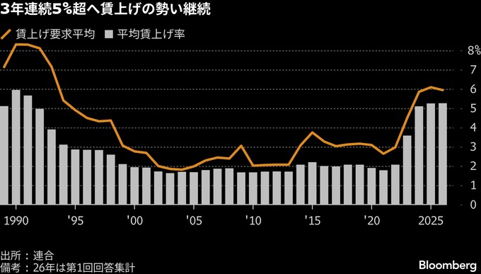 (ブルームバーグ):日本最大の労働組合の全国組織である連合が23日公表した2026年春闘の第1回回答集計では、3年連続5%を超える賃上げに向けて順調なスタートが示された。日本銀行にとって金融政策の正常化を支える材料となる。
