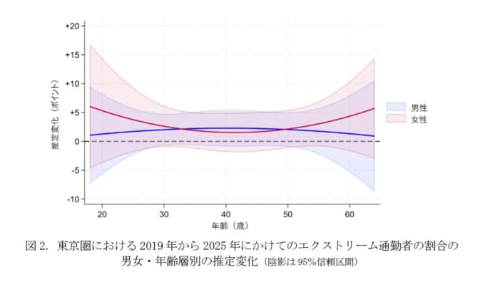 同様の傾向は、東京圏における2019年と2025年の男女・年齢層別のエクストリーム通勤者の推定割合を重ねて示した調査からも確認することができた。