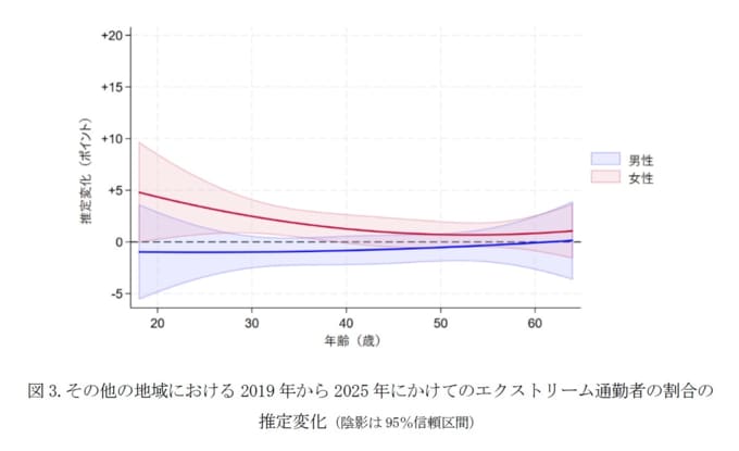 同様の傾向は、その他の地域における2019年と2025年の男女・年齢層別のエクストリーム通勤者の推定割合を重ねて示した調査からも確認することができた。