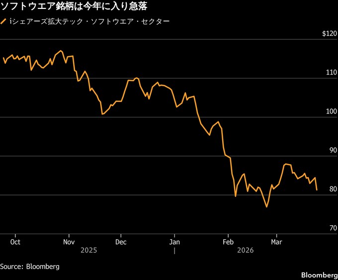 ソフトウエア銘柄は今年に入り急落。アンソロピックなど新興企業による新型AIツールの投入を受け、事業モデルが脅かされるとの懸念が強まっている。