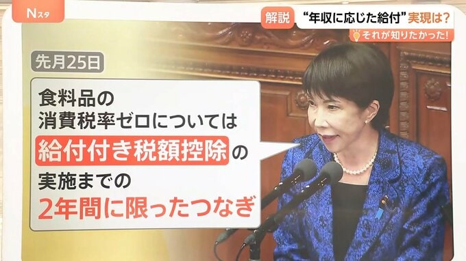 2月25日、高市総理は、あくまで「食料品の消費税率ゼロについては、給付付き税額控除の実施までの2年間に限ったつなぎ」と話していました。
