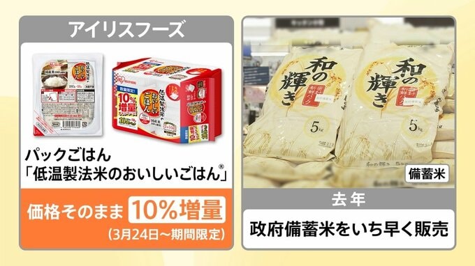 アイリスオーヤマのグループ会社「アイリスフーズ」が、24日から期間限定で販売開始しているパックごはん「低温製法米のおいしいごはん」は、価格はそのままで10%増量しています。