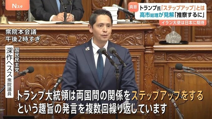 国会では先週の日米首脳会談について質疑が行われ、野党側は、トランプ大統領が中東情勢をめぐり日本に求めた「ステップアップ」の真意について、高市総理の認識を問いただしました。