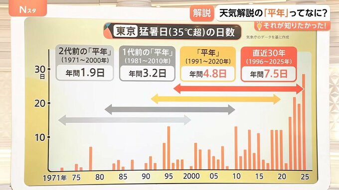 今はどんどん気候が変化していることもあり、「平年」も変化しています。その「平年」の感覚のズレが分かりやすいのが、東京の年間の猛暑日日数です。