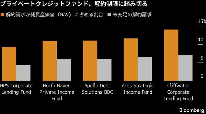 ブルームバーグが追跡するプライベートクレジットファンドのうち、今四半期にテンダー(持ち分買い付け)結果を公表したファンドの純資産は計約1330億ドルに上る。これらのファンドの解約請求は合計で約10%に達し、3カ月前からほぼ倍増した。